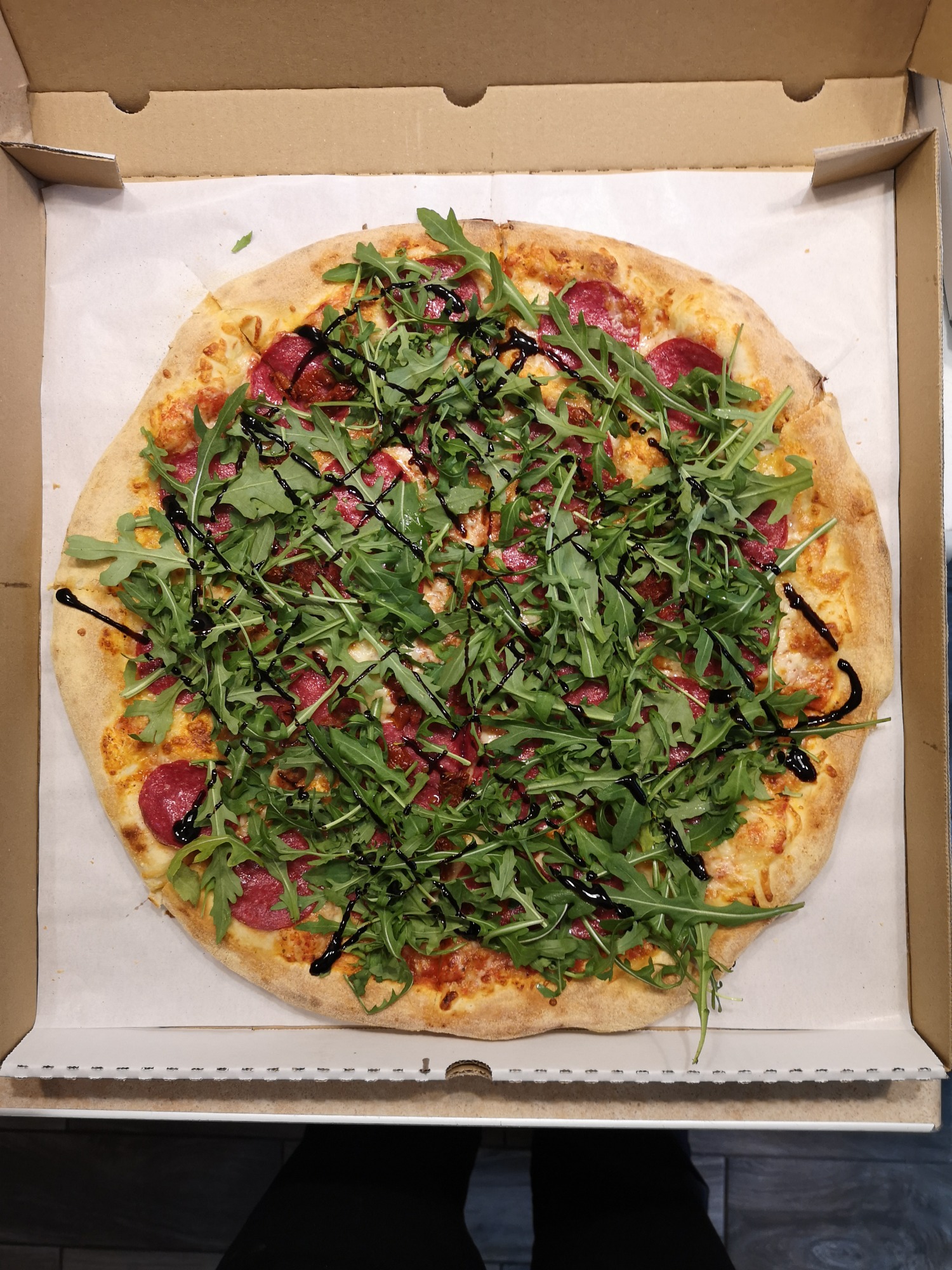 Sos pomidorowy, CEBULA CZERWONA, Oliwki czarne, Feta, Salami, Ser -